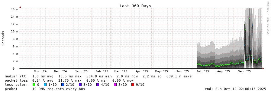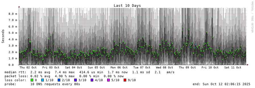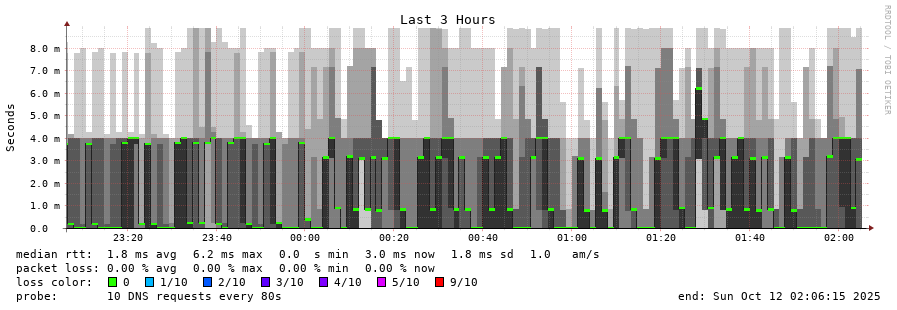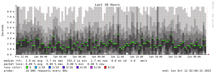 traceroute to 9.9.9.9 (9.9.9.9), 30 hops max, 60 byte packets - Generated at 2025-10-12 00:00:01 3 > pch.mrs.franceix.net (37.49.232.61) [AS57734] 1.101ms 0.933ms 1.187ms 4 > dns9.quad9.net (9.9.9.9) [AS19281] 0.742ms 0.644ms 0.364ms