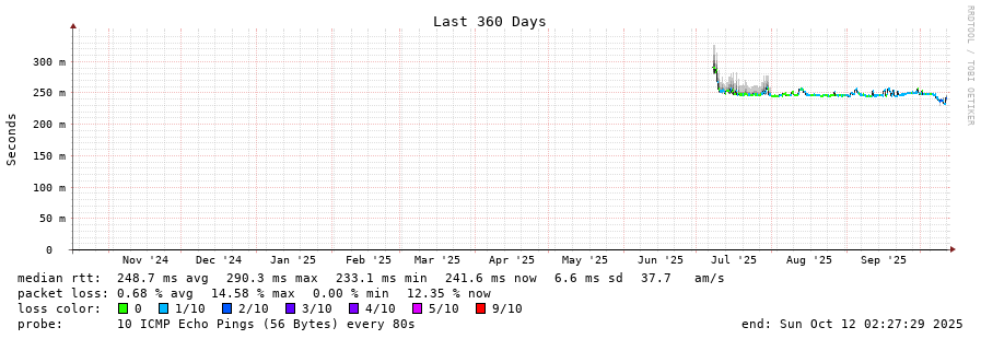 5 > ae8.0.pjr03.ldn001.flagtel.com (85.95.25.194) [AS15412] 264.485ms 264.349ms 264.400ms