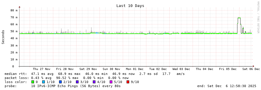 traceroute to 2001:67c:1e0:0:c225:e9ff:fea8:6a0a (2001:67c:1e0:0:c225:e9ff:fea8:6a0a), 30 hops max, 80 byte packets - Generated at 2025-12-06 12:45:02