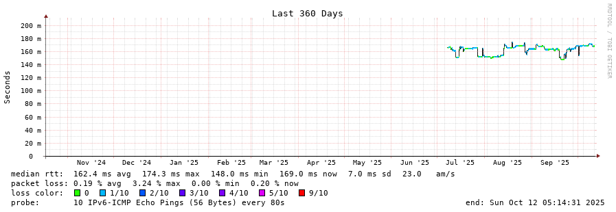 traceroute to 2604:2dc0:202:200::1f9 (2604:2dc0:202:200::1f9), 30 hops max, 80 byte packets - Generated at 2025-10-12 02:30:01