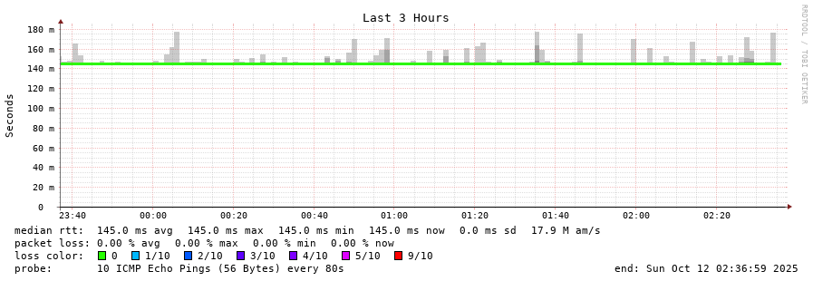 13 > 190.52.127.233 (190.52.127.233) [AS262182] 145.081ms 145.111ms 145.215ms