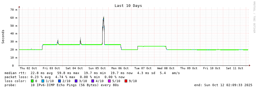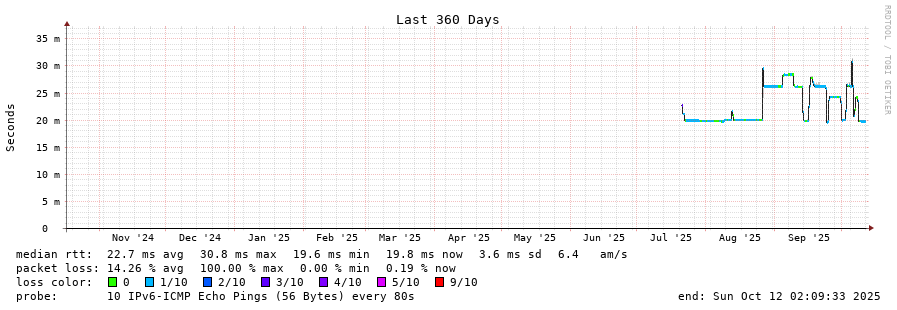 traceroute to 2001:49f0:d0b0:6::2 (2001:49f0:d0b0:6::2), 30 hops max, 80 byte packets - Generated at 2025-10-11 23:45:01